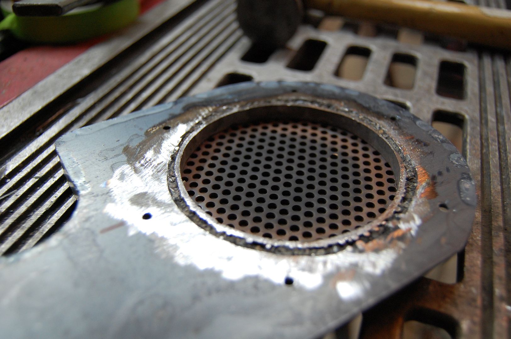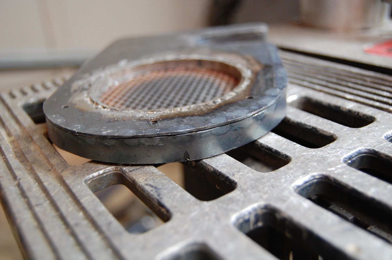 From there I tack welded on the mesh to the one end of the 1/4″ thick 3″ exhaust pipe and then welded the cut out center circle to the back of the mesh and pipe. This gave a nice sealed recess with the mesh inside and a solid backing.
