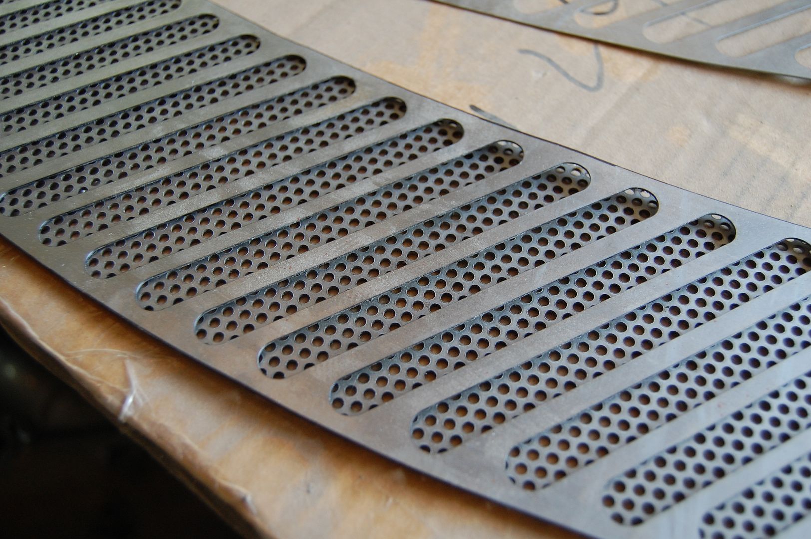 The plan is to have these grills as a three layer sandwich. First weld the mesh to the grill on the backside where the welds will not be visible. Second will be a layer of 1/16″ steel drilled and welded around the edges.
