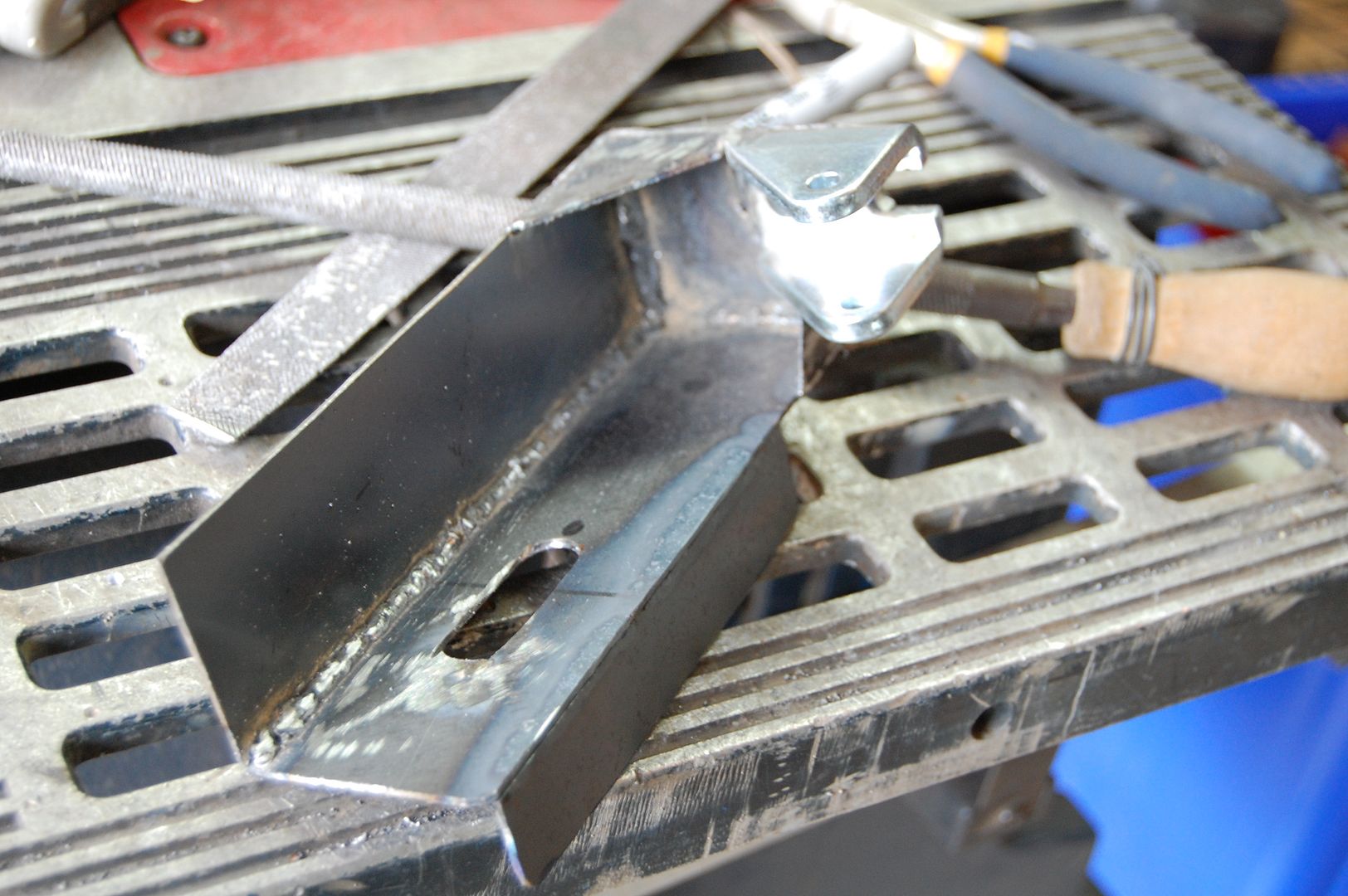 The bracket had a slot down the middle which allows me to adjust the actuator position. I also welded a tab down the side of the bracket to ensure that it will not turn/twist under load.