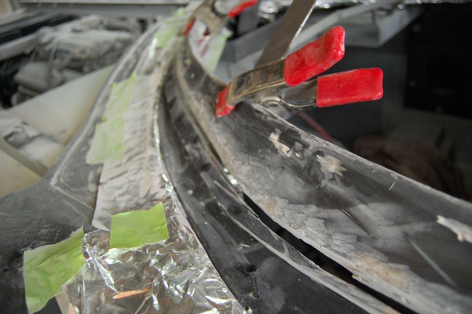 I also used some clamps to hold the free floating pieces from dropping into the cabin of the car and ground away a bit of the excess material. I also used a couple of screws to hold the bottom pieces so that they didn’t move around while I was laying down the fiberglass.