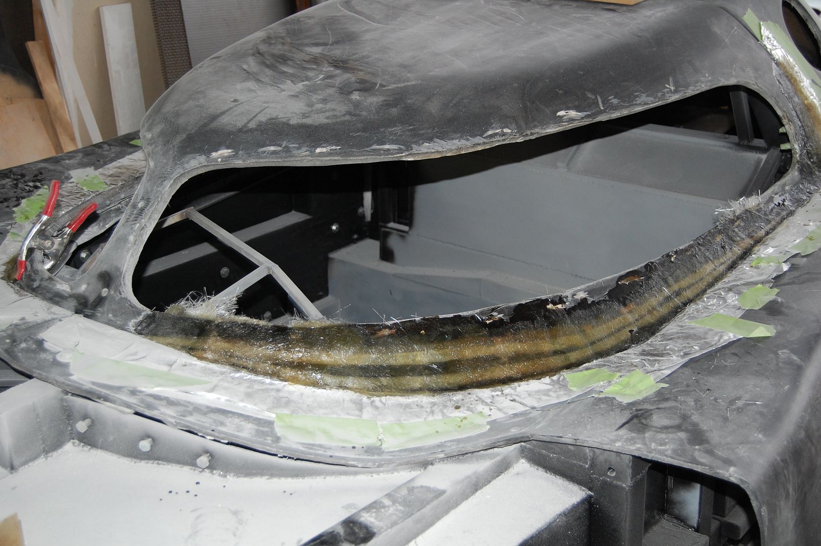 I let all the fiberglass cure overnight, so today will be more work trimming and blending the new fiberglass into the canopy.