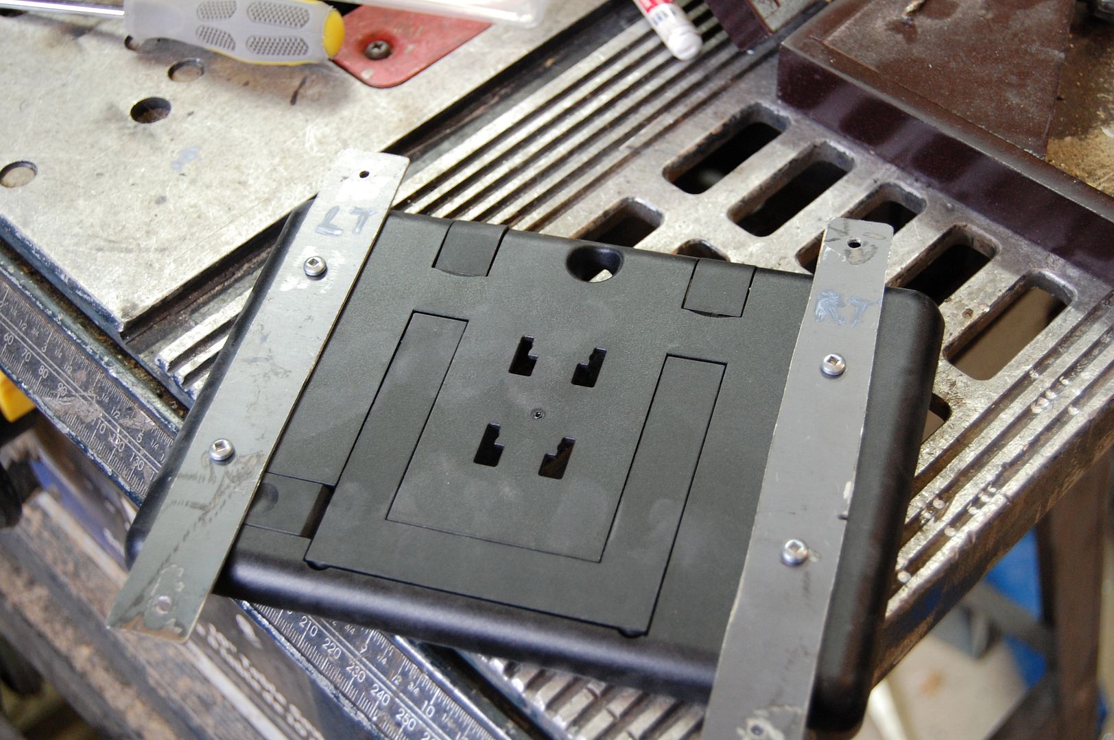 Now that the steering wheel had been taken care of, it was time to tackle the PlayBook mount. I started off by using an existing PlayBook holder that has both a prop stand and a connector to hang on your headrests. I used two strips of steel and screwed them to the back of the plastic holder.