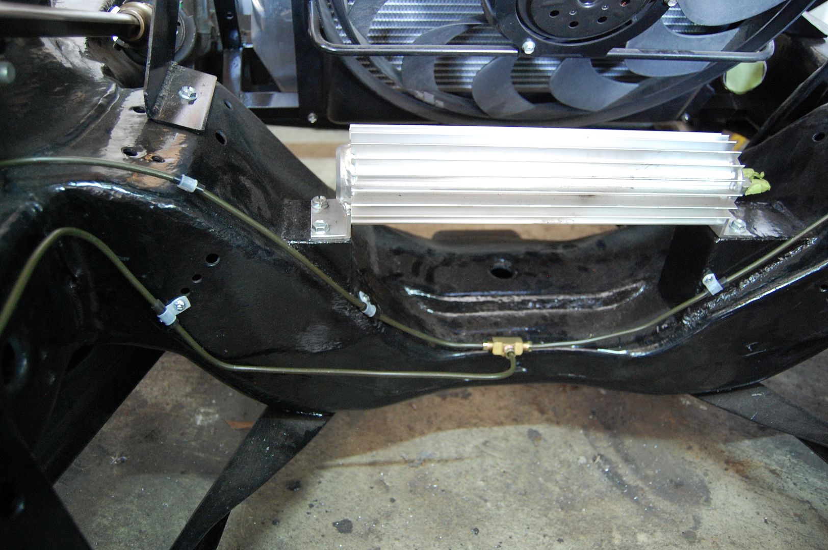 I started at the front of the car by running lines from both of the front flex lines back down to a “T” fitting at the bottom of the old engine cross member. Getting the angle correct at the flex line joining point where I could still get a line wrench on the fitting and clear the shock was a matter of trial and error. But in the end it turned out pretty nice.